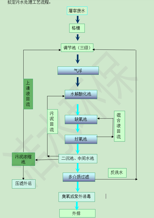 根據(jù)廢水特點及處理出水要求,該廢水處理工藝采用物化+生化處理工藝是必需的。廢水CODcr與色度較高,廢水中油脂濃度超過40mg/l時,油脂粘附于生物膜表面,阻斷廢水與生物膜的接觸,使生化去除效率下降;廢水中含有的大量豬毛、肉屑、骨屑、內臟雜物、未消化的食化和糞便等也不易生化,因此該廢水必需采取必要的預處理及物化處理,盡量降低進入生物處理構筑物的懸浮物和油脂含量,再進行生化處理,確保生化處理的正常運行。屠宰廢水除了濃度高,色度高外,還有胺氮,總磷超標比較難處理,因此在設計過程中應該考慮到它們的去除。